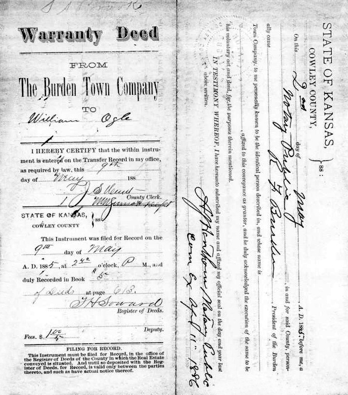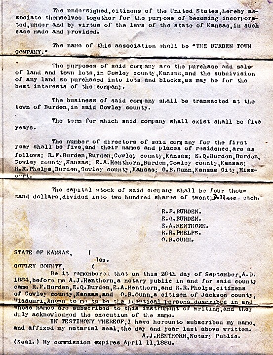 In the early history of Kansas, Burden is described as the child at the railroad in-as-much it came to the railroad rather than the railroad coming to it. In 1879 the town site of Burden was surveyed by a town company consisting of R. F. Burden, Ford, and Leonard, O. B. Gunn and T. K. Johnson. R. F. Burden was the chairman of this company and the town was so named in compliment to him. The ground for the site was purchased from Isaac Gatton and, Finley Graham.
